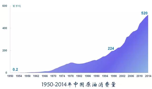 石油在中國(guó)一次性能源消費(fèi)中占比20%,僅次于煤炭,但是是有對(duì)國(guó)防安全具有重大的戰(zhàn)略意義,是必不可少的戰(zhàn)略資源。中國(guó)石油消費(fèi)與日俱增,從50年代的24萬(wàn)噸激增至2014年的5.2億噸,是建國(guó)時(shí)的2600倍。