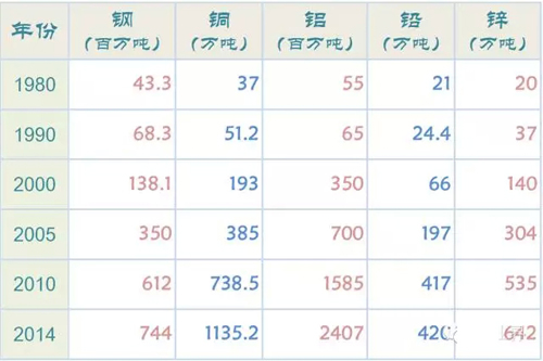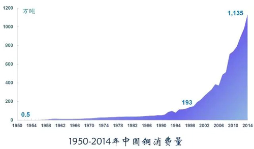鋼鐵用量約占金屬消費(fèi)的75%,是工業(yè)的骨骼。鋼鐵是工業(yè)化過(guò)程中最重要的原材料之一,2014年中國(guó)消費(fèi)鋼鐵7.44億噸,是建國(guó)時(shí)的1240倍。